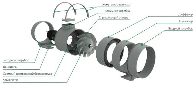 - Центральный блок с двигателем съемный и крепится к патрубкам корпуса застежками, что делает обслуживание вентилятора весьма удобным
